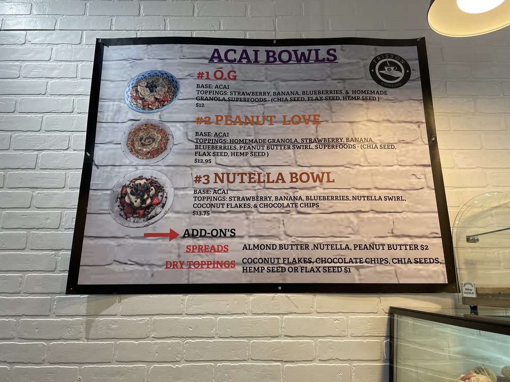 Base: Acai with strawberry, banana, blueberry, coconut flakes & chocolate chips topped with a Nutella swirl